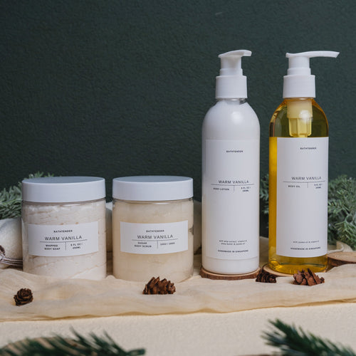 Available as whipped soap, sugar body scrub, body lotion and body oil.